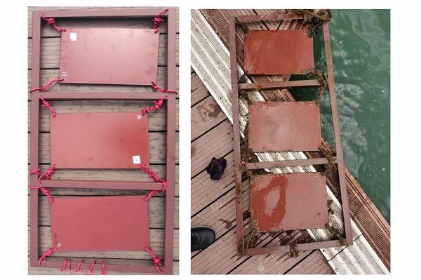 2019年8月,在中船某所的主持下,依照標(biāo)準(zhǔn):GB/ 5370-2007防污漆淺海掛樣試驗(yàn)方法,經(jīng)過(guò)一年在海口的防腐防污掛片(多家對(duì)比)加速實(shí)驗(yàn)驗(yàn)證,實(shí)驗(yàn)結(jié)果顯示常州的江蘇泛亞微透科技股份有限公司新材料氣凝膠涂層的鋼板具有防腐蝕,防海生物附著的優(yōu)異效果;泛亞微透繼續(xù)將此掛片持續(xù)進(jìn)行了3年的掛海試驗(yàn),試驗(yàn)效果照片如下: